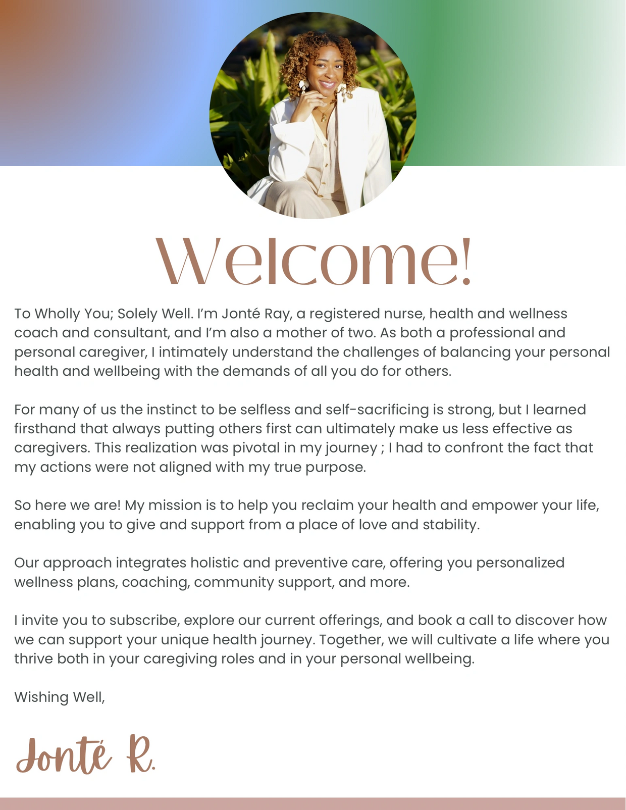 Our vision remains elegantly simple: Wholly You; Solely Well. We are dedicated to empowering you on your distinctive health journey, ensuring you have the knowledge and support needed to thrive in every aspect of your life—including the vital practice of caring for yourself.